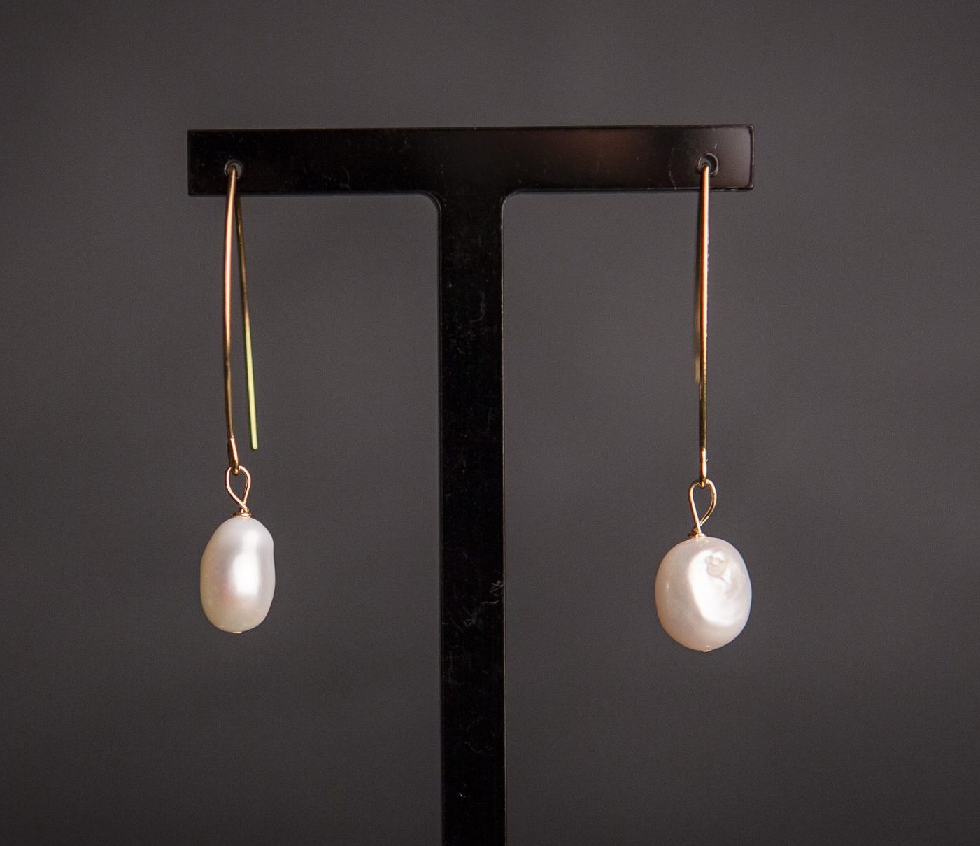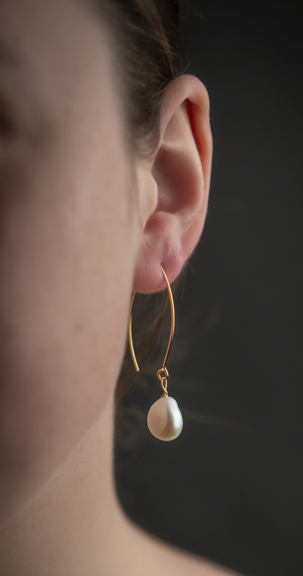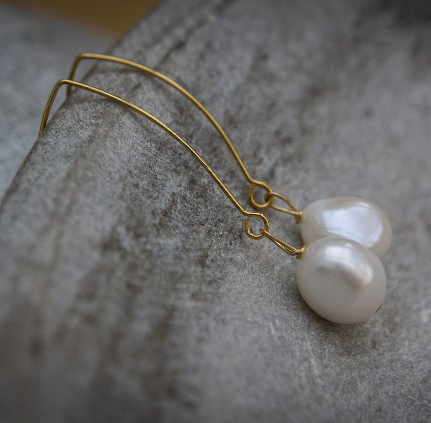 A pair of beautiful baroque pearl drop earrings crafted from a pair of high quality white baroque pearls. A modern, yet simple design which can be worn during the day with jeans or dressed up in the evening.