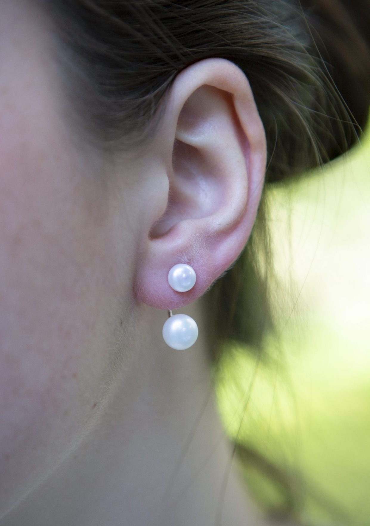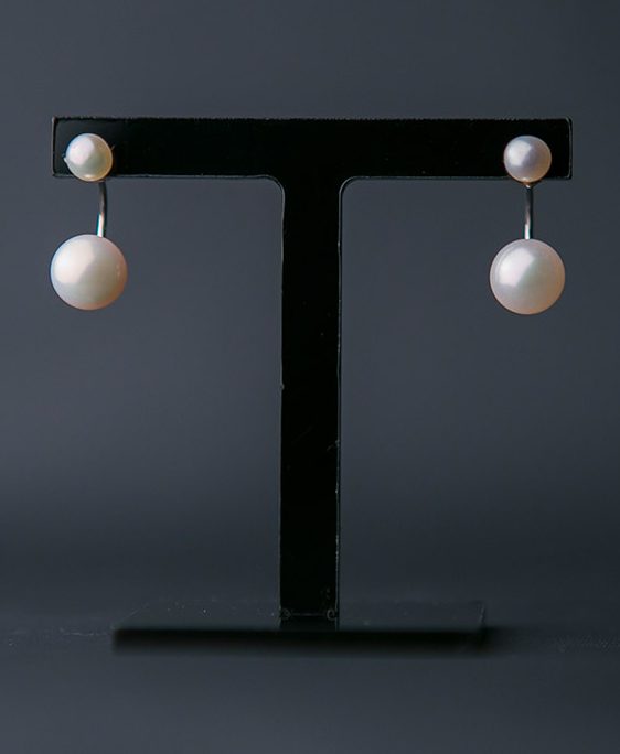 A stylish and contemporary ear jacket, crafted from white fresh-water pearls and sterling silver. The lower pearl appears to float around or below the ear in a modern and refreshing way. The earring can also be worn as a stud earring as it is supplied with an additional pair of butterfly silver backs – in essence giving you two styles of earrings.