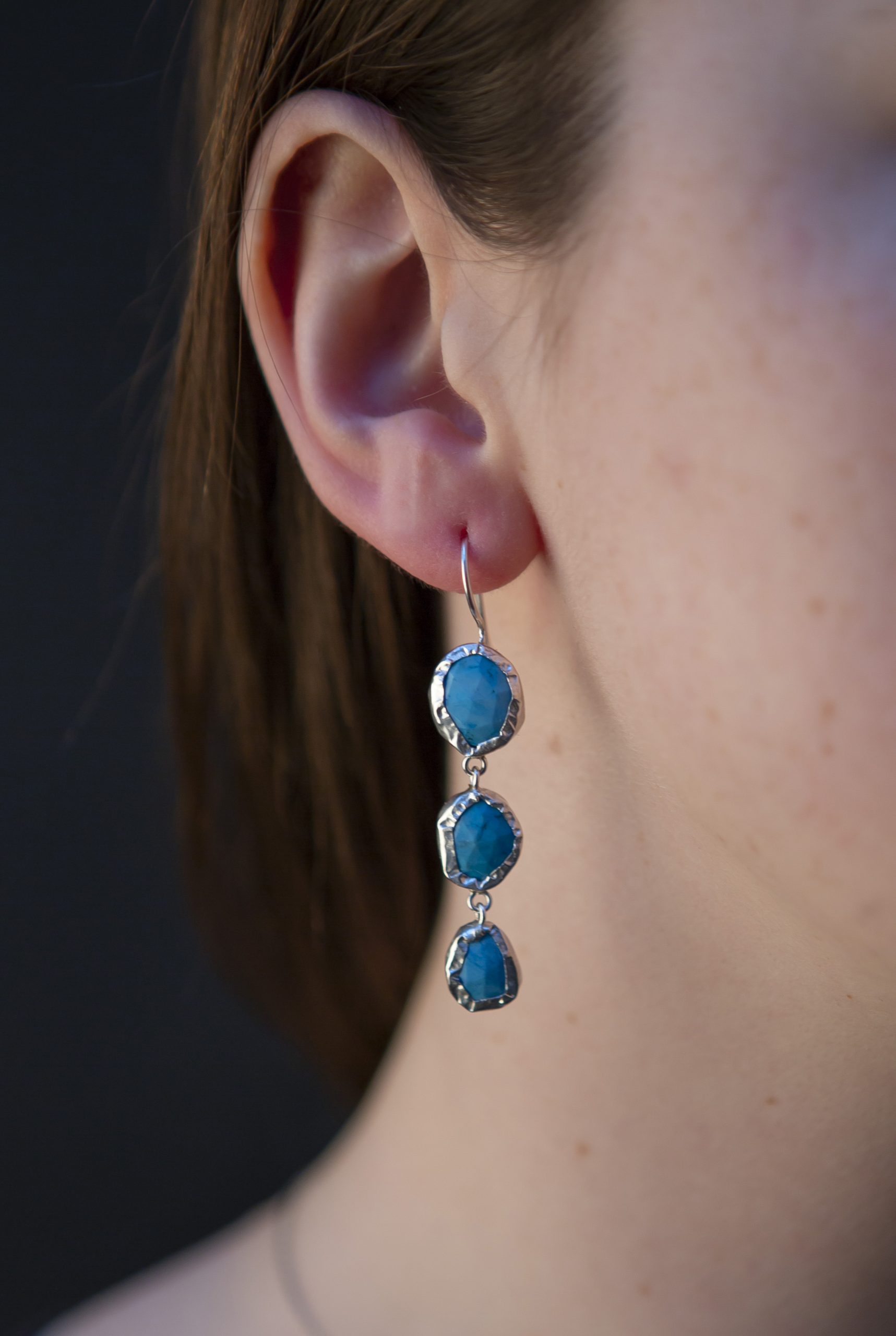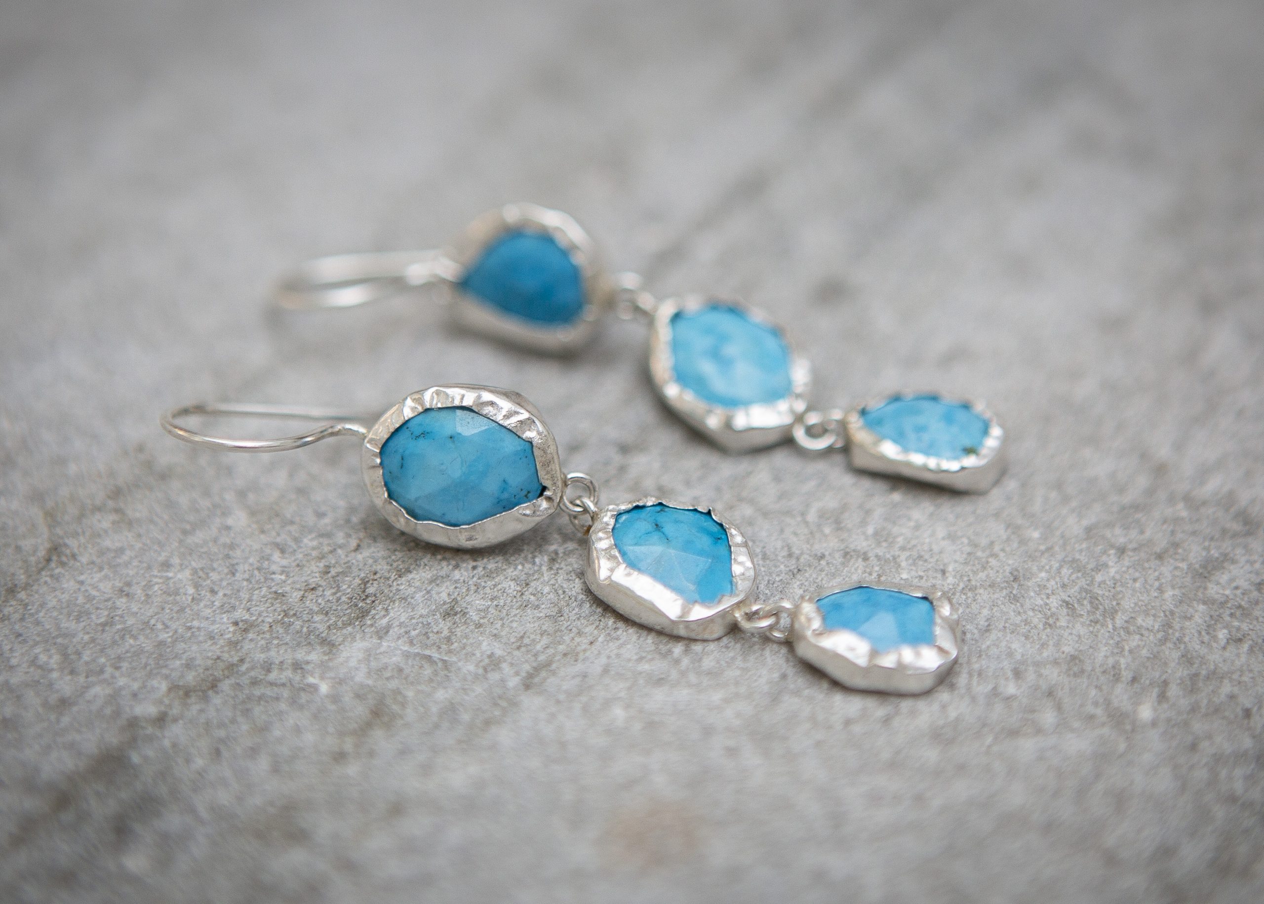 The lovely rough cut turquoise howlite gemstones have been handpicked for their gorgeous colour and are wrapped in sterling silver. The stones are irregular in shape giving the earrings a wonderful sense of uniqueness.